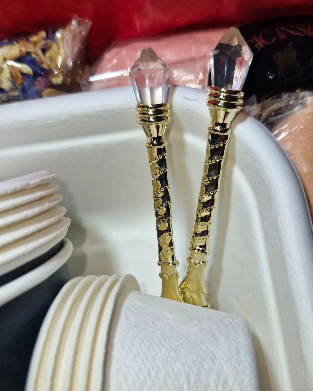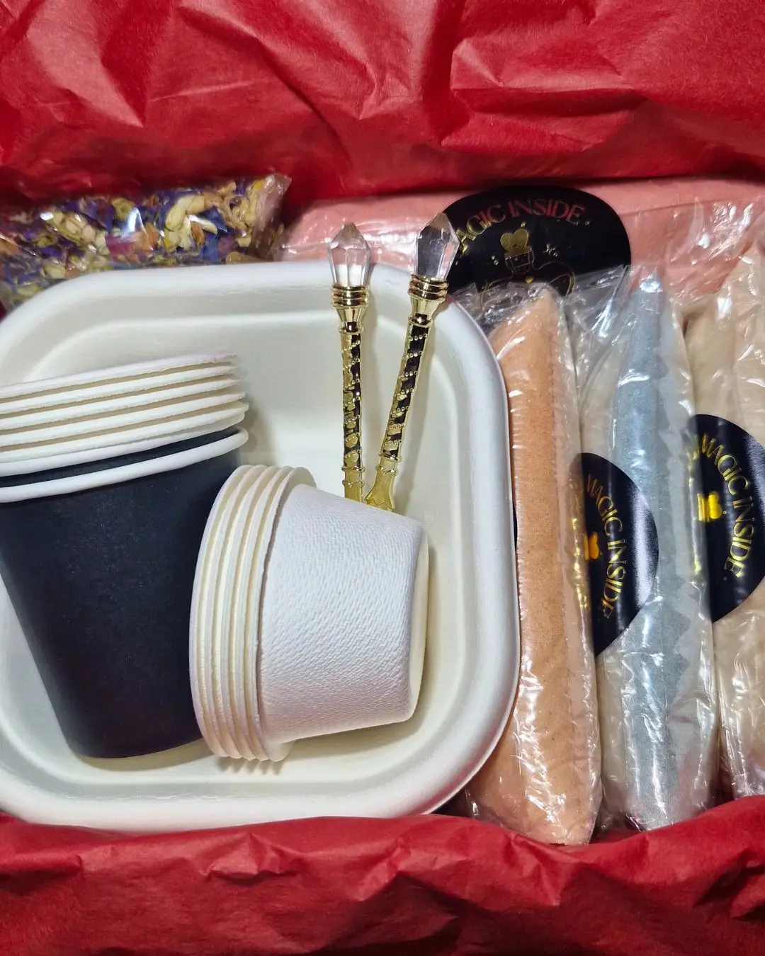 - Packaged in a beautiful Sparkle & Spell Co. box with red tissue and red and gold flecked ribbon
